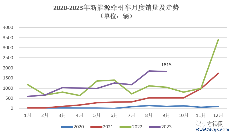 从2023年新能源牵引车销量表现来看,3-9月份,国内新能源牵引车销量基本保持在千辆级规模。从增速来看,进入下半年新能源牵引车发展提速,7-9月,同比增长超六成,9月份同比大涨73%,创下2023年最高记录。