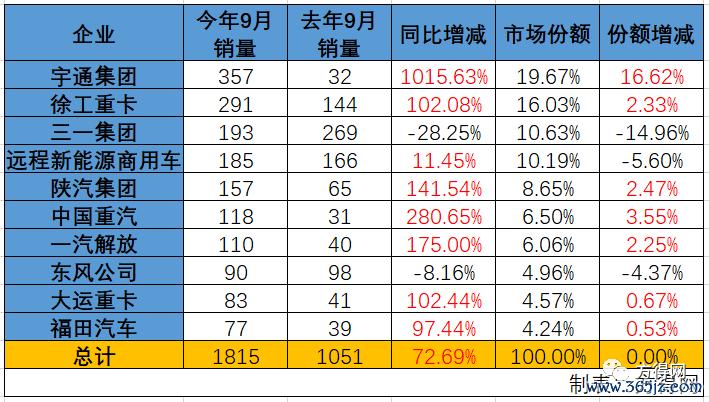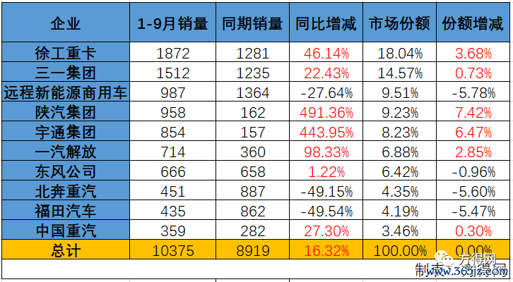 从份额变化来看,1-9月,行业销量前十中有6家企业较去年同期实现了份额增长。陕汽、宇通增幅最多,分别提高7.42、6.47个百分点;徐工增长3.68个百分点;解放增加2.85个百分点。此外,三一、重汽份额较同期也实现了增长。