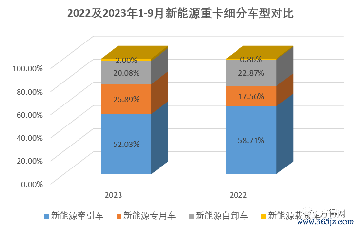 从销量来看,2023年1-9月,新能源牵引车累销10375辆,新能源专用车累销5163辆,新能源自卸车累销4004辆,新能源载货车累销398辆;新能源重卡市场累计销售19940辆。